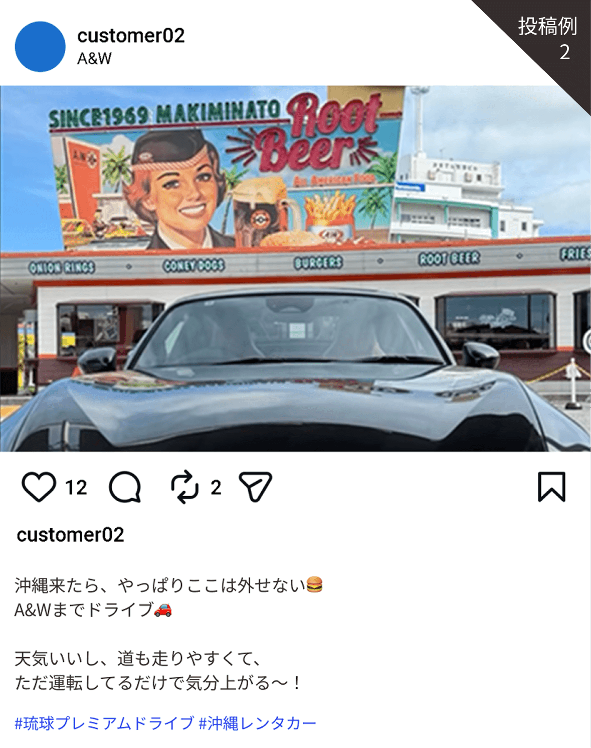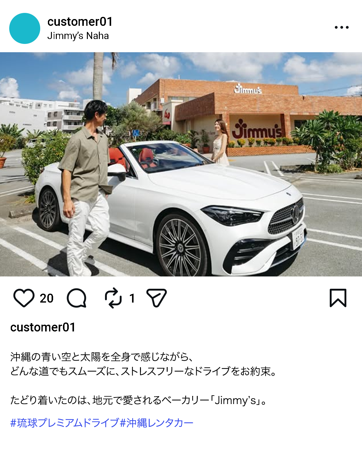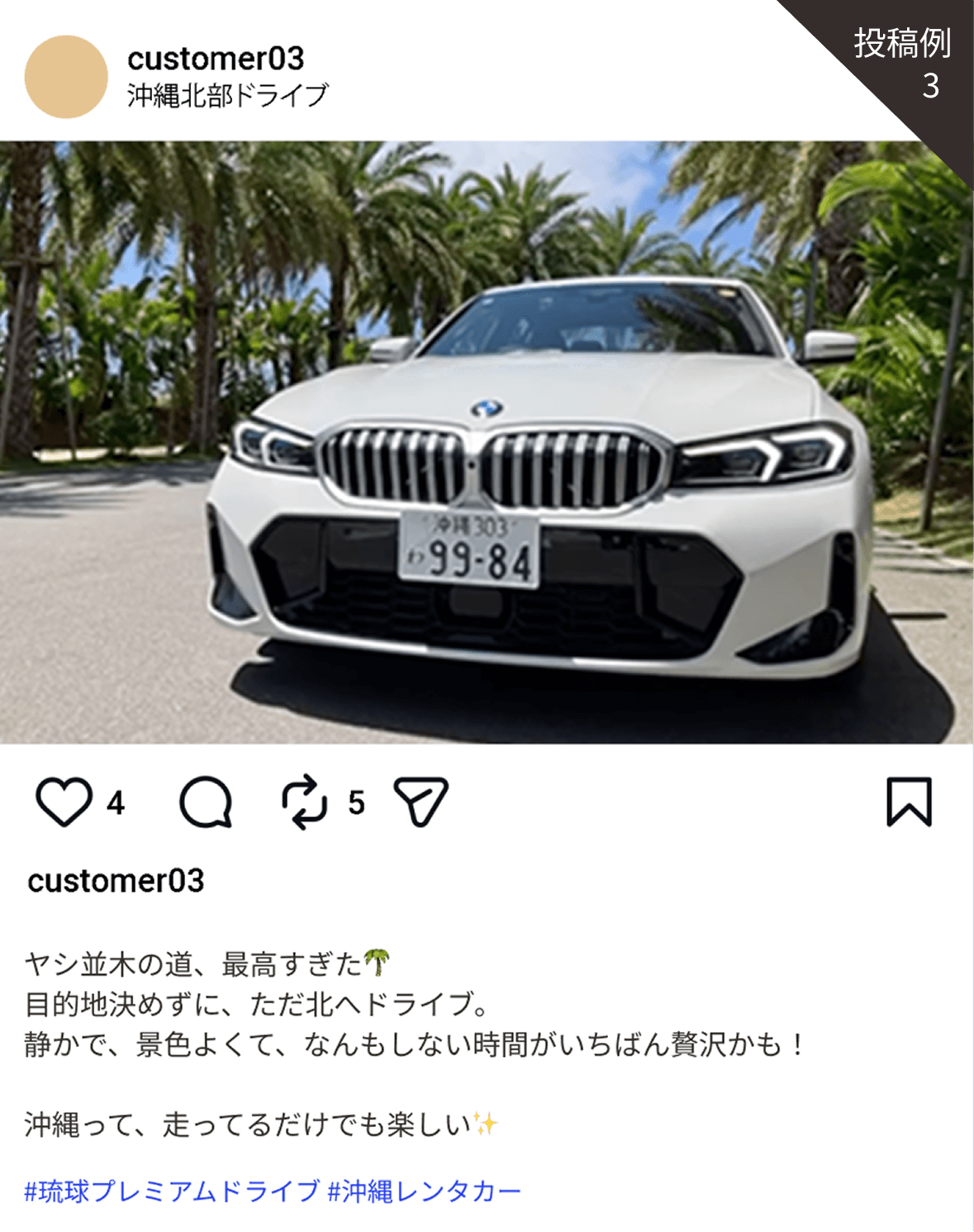 自身のインスタにて「#琉球プレミアムドライブ」「 #沖縄レンタカー」のハッシュタグをつけて投稿